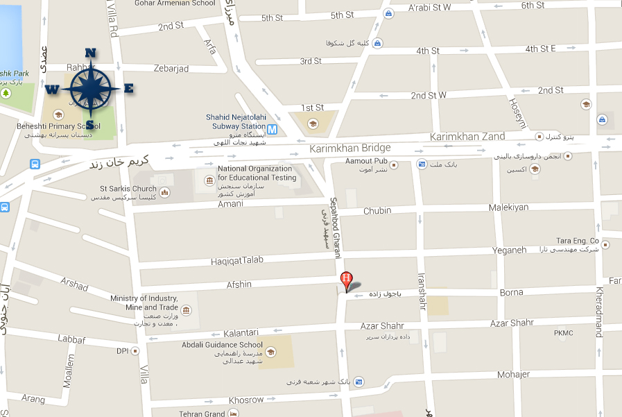 آدرس پستی : تهران - میدان فردوسی - خیابان شهید سپهبد قرنی - نرسیده به پل کریمخان - کوچه شهید باجول زاده - پلاک 19 - واحد4 نقشه